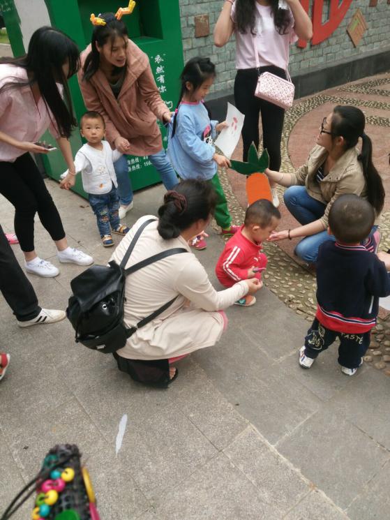 熊银香同学拿出自制的“大萝卜”,一上场就吸引了孩子们的注意。起初只有吴靖雯扮演的小羊在“拔萝卜”,她一边唱着嗨哟嗨哟拔萝卜一边邀请小朋友们和她一起。孩子们迈着蹒跚的步伐走到她身边手拉着手一同“拔萝卜”。其他的组员也应声而上拉着小朋友们的小手共同努力,可爱的“萝卜”应声而倒。孩子们不再腼腆高兴的笑了起来。姐姐们手拉手跳起了简单的舞蹈,孩子们也跟着蹦蹦跳跳,欢闹的景象也吸引了更多家长和孩子们的注意。还有家长询问同学放的音乐名字表示要回家也放给孩子听。