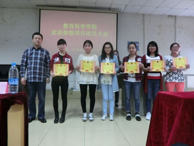 本网讯(学通社见习记者 顾敏)4月23日下午,教育科学学院2015年素质修炼动员大会在老图书馆3号报告厅举行。教育科学学院党总支书记庄传超,院长熊华生,副院长范丹红、刘永存,小学教育专业负责人张炜等出席。