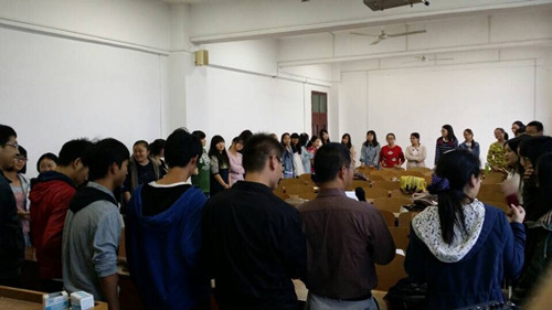 吴老师首先简单地介绍了今天启动仪式的流程,然后以其独创的热身运动——“左右”口令活动让现场气氛瞬间活跃了起来。所有与会人员绕着教室的方形座椅围城一个大圈,规则为听到“zuo”或“you”后,用自己的左手拉上对方的右手或用右手拉上对方的左手,并且自己的左手或右手不能让别人拉上。由于zuo”或“you”出现的频率过高,大家有点反映不过来,最后吴老师提前终止了热身活动,并说明游戏规则可能需要修改。即使这样,这个热身运动也使参与的每个人体会到了乐趣,对吴老师的坦率产生了深深的敬佩,更对小组今后的活动充满了好奇。