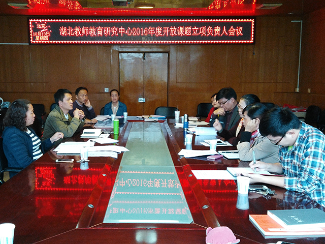 10月13日下午,省级高校人文社科重点研究基地湖北教师教育研究中心在我院会议室召开了2016年度开放课题立项负责人会议。教育科学学院院长、湖北教师教育研究中心主任张红梅出席会议并讲话,课题负责人潘海燕、范丹红、陈光春、汪丞、肖凯、长阳实验小学漆昌琼,长阳县教育研究与教师培训中心刘昌菊,光谷五小左军娥等老师参加了会议,刘永存主持会议。