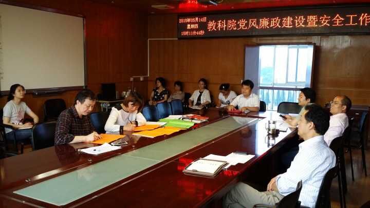 [来自:教育科学学院 发表时间:2015-05-22] (本网讯:吴贤华)2015年5月14日下午,教育科学学院全体教职工集中于院会议室集中学习“党风廉政建设暨安全工作会议”。会议由院党总支书记庄传超主持。 庄书记强调:5月份是党风廉政建设宣传月,宣传主题为“讲纪律、守规矩、作表率”。在会议上签订了教育科学学院2015党风廉政建设责任书。同时布置了撰写“三严三实”体会作业。对于党风廉政建设与安全责任事件,要坚持追责、问责常抓不懈、高压态势不放松。 【打印本页】【关闭窗口】