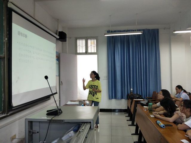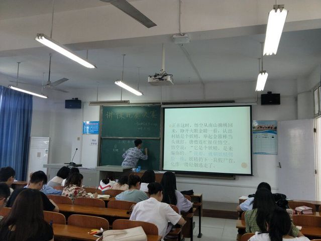 本网讯(记者曹雨曦)“大家一起告诉老师,我们今天要学习的是哪一首古诗呀?”大学教室变身小学课堂,同班同学扮演学生进行互动。近日,文学院2017级汉语言文学专业讲课比赛拉开序幕,两个班级分别展开预赛,选取各班前六名参加决赛,评委也由班级内部同学担任。
