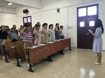 “我志愿成为一名学前教育者……”2016级学前教育专业王端瑞带领全班集体宣誓,表达大家对于此次实习吃苦耐劳、不怕困难的态度。