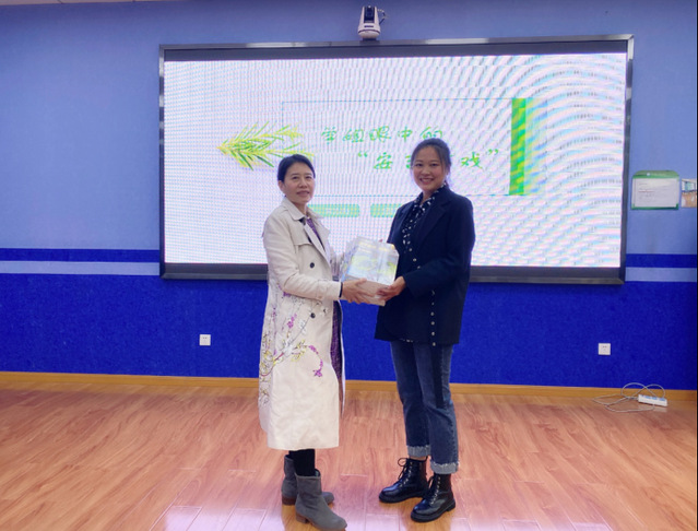 讲座最后,朱方舟为教科学子捐赠安吉游戏专著《放手游戏,发现儿童》,教科院学前教育专业负责人伍香平教授接受捐赠并勉励同学们,希望更多像方舟同学一样优秀的师姐回来为同学们做指导,也期待下一次会是你们给学弟学妹做分享交流,将这份感恩延续下去。