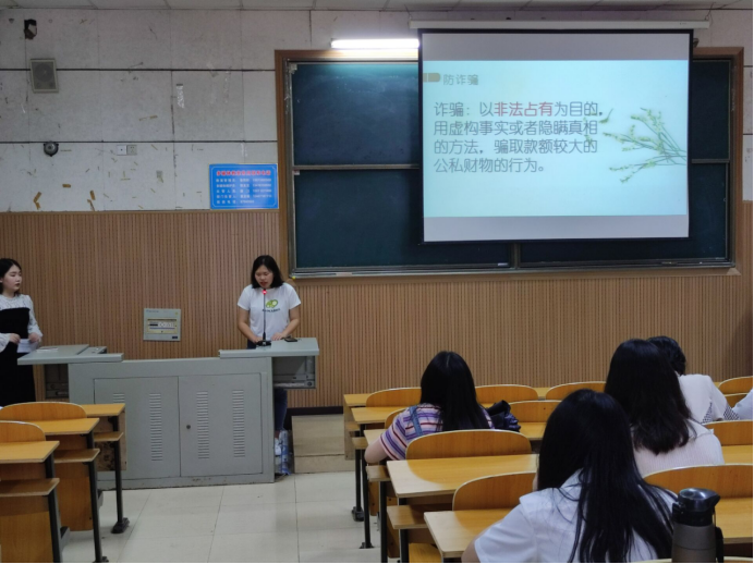 接着,20级教育学类2班杨金霞进行寝室长培训会。她从寝室卫生及安全、大学生心理健康、人际关系交往以及寝室公约四个方面对寝室长进行培训。她重点对寝室安全进行讲解,通过多个例子讲解电信诈骗的常用套路并提醒各位寝室长注意寝室安全。