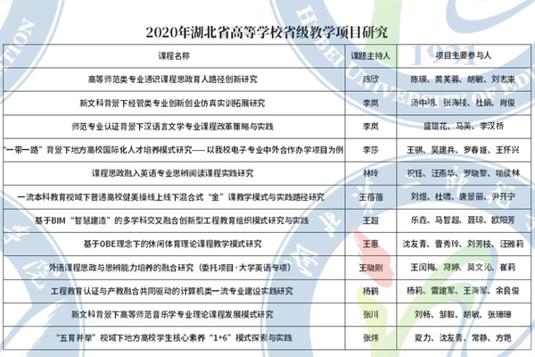 本网讯 近日,湖北省教育厅下发《省教育厅关于公布2020年湖北高校省级教学研究项目的通知》。我校12个项目入选2020年度“湖北省高等学校省级教学研究项目”。