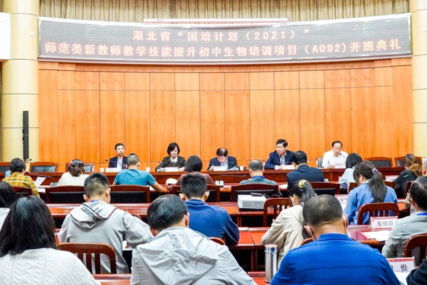 本网讯(通讯员 任春红)10月9日上午,湖北省“国培计划(2021)”师范类新教师教学技能提升初中生物培训项目(A092)开班典礼在我校行政楼一号会议室举行。副校长胡兴、湖北省普通教育干部培训中心常务副主任王勇出席,化学与生命科学学院分党委书记严莉萍主持。