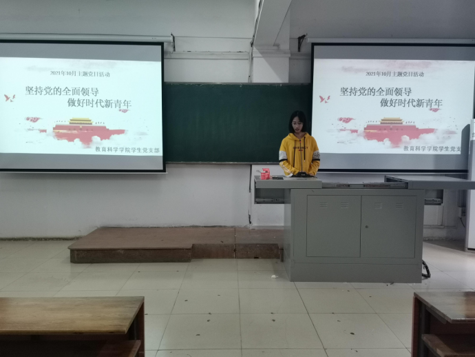 (通讯员 魏雅兰)10月28日中午12:10,教育科学学院(以下简称“教科院”)学生第一、第二党支部于5308教室开展以“坚持党的全面领导,做好时代新青年”为主题的十月主题党日活动。教科院学生党支部二支部书记杨霞出席本次活动。学生第一、第二党支部全体预备党员和党员参加。2019级应用心理学1班董文杰主持。