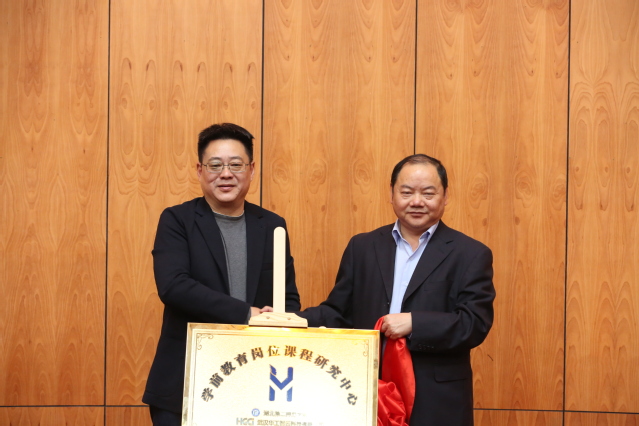 最后,湖北第二师范学院党委副书记许邦官和武汉华工智云科技有限公司董事长谭伟为本次仪式揭牌并与研究中心成员合影留念。