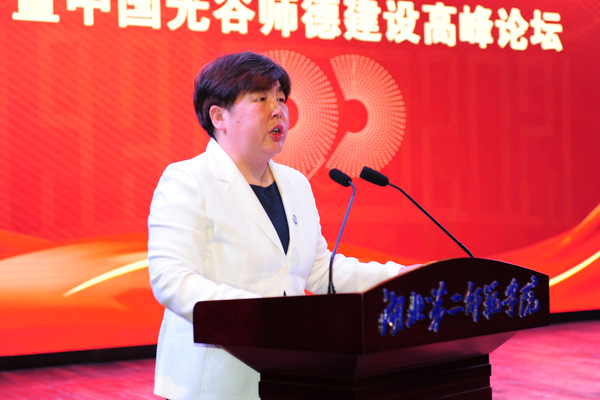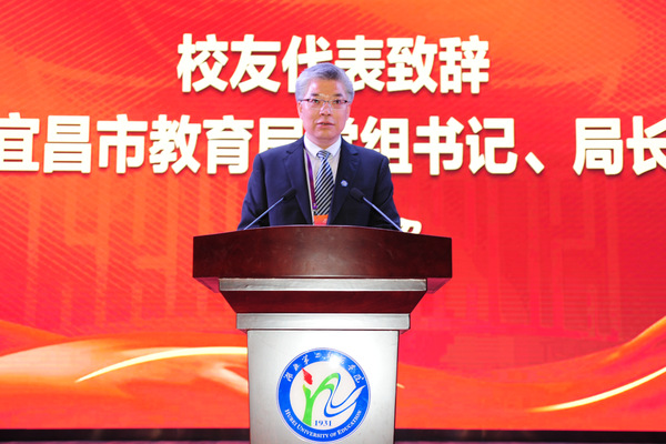 校友代表、宜昌市教育局党组书记、局长覃照;教师代表、“楚天园丁奖”获得者、文学院院长盛银花;在校生代表、2018级物理学专业武亦文分别发言。