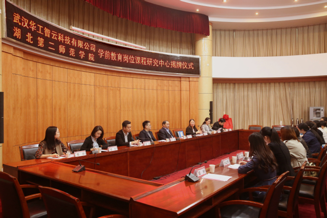 (通讯员 李清宇)11月2日上午9:30,湖北第二师范学院—武汉华工智云科技有限公司学前教育岗位课程研究中心揭牌仪式在学校行政楼一号会议室成功举行。湖北第二师范学院党委副书记许邦官、武汉华工智云科技有限公司董事长谭伟、湖北第二师范学院教育科学学院院长张红梅、武汉华工智云科技有限公司总经理黄波、湖北第二师范学院教育科学学院副院长陈荣、张炜、武汉华工智云运营总监张婷及项目团队成员、教育科学学院项目成员及师生代表参会,教育科学学院副院长陈荣主持会议。