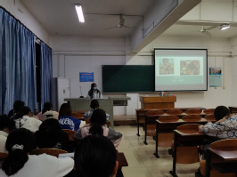 在活动过程中,罗玉梅以在武汉市光谷第二十七小学做志愿者时的经历为例,主要为学生介绍其带领小朋友发挥想象力利用各种树叶进行作画的活动。她向学生们展示小朋友的作品及其他志愿者与小朋友互动的相关图片,旨在让学生能直观地看到小朋友的创造力和志愿者新颖的教学方法带来的成效。