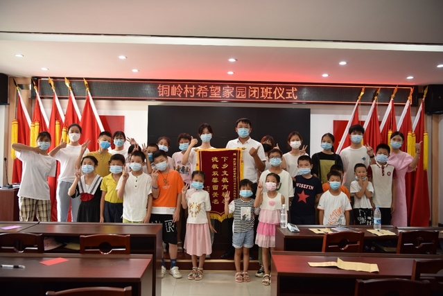 本网讯(通讯员张彦霏)8月2日,湖北省荆州市荆州区八岭山镇铜岭村党委员服务中心向我校四叶草青年志愿服务队驻铜岭村第三小队赠与锦旗。在第三小队支教的闭班仪式上,党委书记马力代表委员会将一面写着“下乡支教育桃李,德教双馨留美名”字样的锦旗送到第三小队队长刘思豆手中,以此表示委员会和家长学生对四叶草青年志愿服务队在荆州市荆州区八岭山镇铜岭村开展的暑期“三下乡”活动表示感谢和赞扬之情。