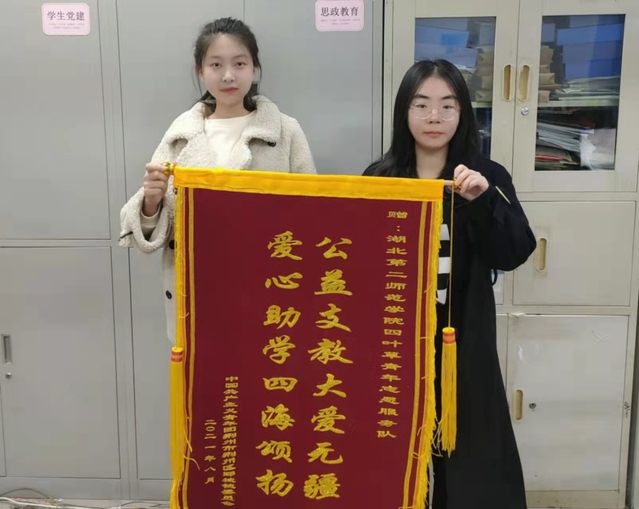 (通讯员 吴何玉)12月6日,中国共产主义青年团荆州市荆州区郢城镇委员会向我校教育科学学院四叶草青年志愿服务队送来锦旗,以此对四叶草青年志愿服务队在荆州市荆州区郢城镇荆北村党员活动中心和茶庵寺社区党员活动中心开展的暑期“三下乡”活动表达出极大肯定与赞扬。