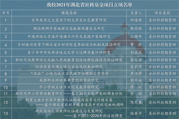本网讯(通讯员 刘菲 熊恺妮)近日,2021年度省社科基金项目(省哲学社会科学重大项目)立项结果公布,我校共有13个课题成功立项。其中,省教育厅哲学社会科学研究项目重点项目立项3项、一般项目立项13项、青年项目立项12项、指导性项目立项1项、专项任务(思想政治理论课)项目立项1项。