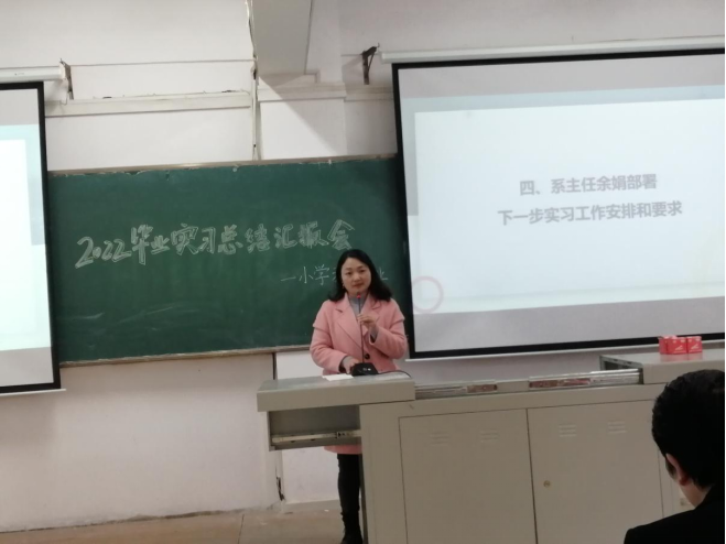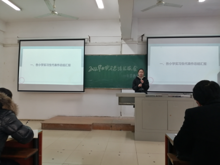 最后,进行大会第四项,由余娟主任对下一步实习工作安排进行部署,要求实习生们必须在1月6日之前将实习手册填写完完整,实习简报审核后进行打印存档,评选优秀实习生,并安排剩下的未实习同学分配到附近小学。