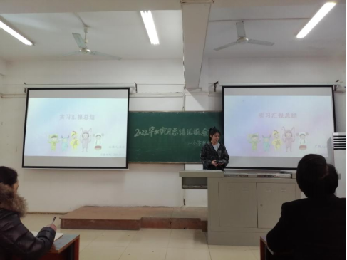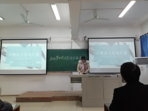 光谷第六小学实习生代表陈珍从四个方面进行汇报:第一是实习概况,由范丹红老师带队;第二是实习目的;第三是实习内容,主要为教学实习和班主任实习。第四是实习收获,阐述他们在进一步了解到小学教师的工作性质特点与教学过程后,明确自己未来的定位目标。