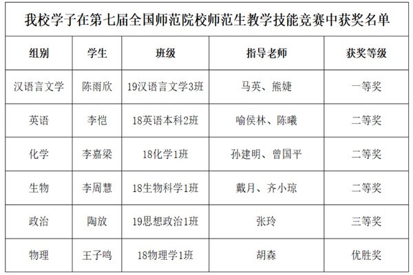 本网讯(通讯员 李娜)1月14日,第七届全国师范院校师范生教学技能竞赛决赛结果公布,我校学子获一等奖1个,二等奖3个,三等奖和优胜奖各1个,创我校参赛历史最好成绩。