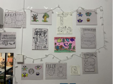 (图为学生将部分简笔画作品制作成“书画墙”)
