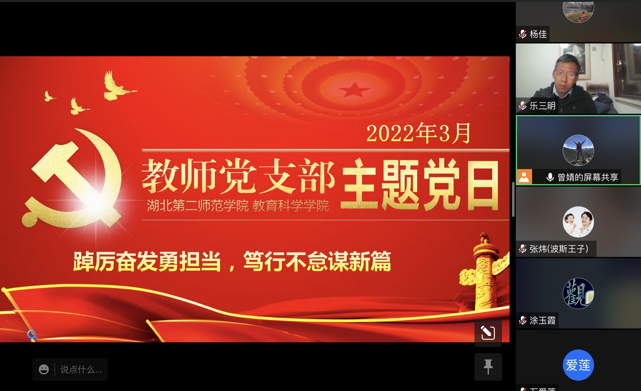 (通讯员 杨佳)3月24日下午8:30,教育科学学院(下简称“教科院”)教师第一、第二党支部于线上开展3月主题党日学习活动。此次活动的主题为“踔厉奋发勇担当,笃行不怠谋新篇”,会议由教师第一党支部书记曾婧主持,教科院教师第一、第二党支部全体党员参加。