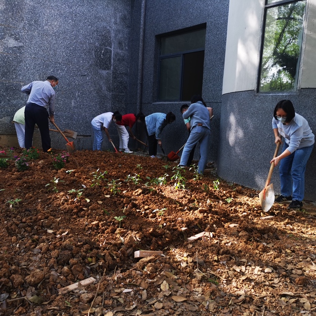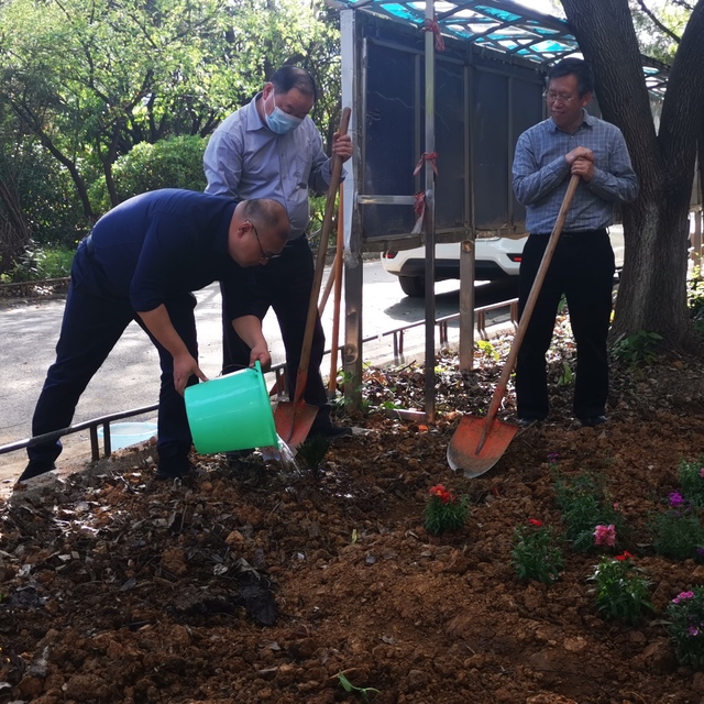 劳动现场气氛热烈,老师、学生党员充分发扬不怕脏、不怕苦、不怕累的精神,挥动着铁锹,除草、翻地、挖坑、栽种、扶树、覆土、培土、浇水,争先恐后、有条不紊地进行劳作。幸福都是奋斗出来的,劳动使人快乐,他们脸上挂着辛劳的汗水,更挂着喜悦的微笑。
