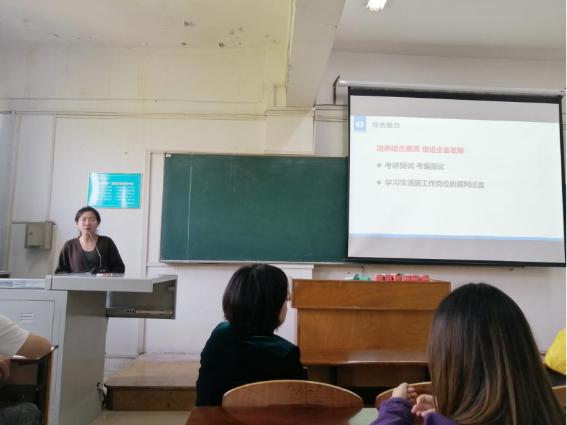 活动伊始,18级小学教育1班姬圆圆分享参赛经验,她不仅向在场学生讲述自己参加两次比赛过程中的一些难忘经历,还从学术潜力、团队协作及综合能力三个方面阐述参加比赛的收获,以此激励在座学生积极参加比赛。紧接着,代黎明解读相关文件,结合姬圆圆的经历讲述参赛对考研复试和后期发展的优势,另外将“互联网+”与“挑战杯”进行对比,让学生对“互联网+”有更多了解,并以我院的“心灵信使”团队为例向学生们表明比赛的成功不是一蹴而就的。同时,代黎明还从参赛有关事宜、如何实现零缺陷以及人才和团队培养向学生们详细讲解,并讲述比赛的含金量和重要性。