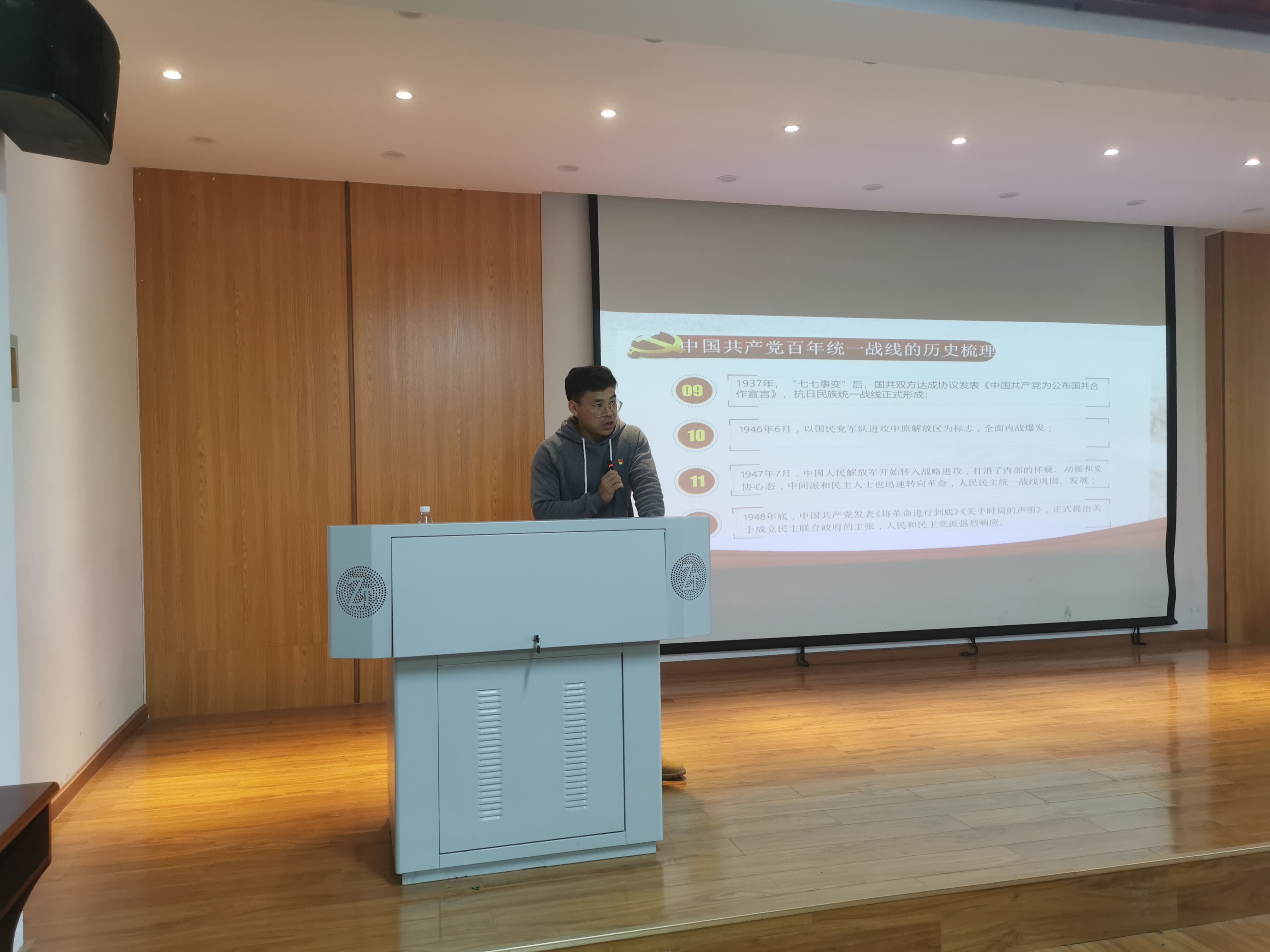 活动过程中,王聪首先对中国共产党百年统一战线的历史进行梳理,让学员更加深入地了解自1921年中国共产党成立以来以党为领导的统一战线工作,在我国建设与发展的各个历史阶段发挥的不可估量的作用。随后,他向学员介绍中国共产党百年统一战线的主要经验,其中包括党如何建立统一战线以及如何发挥好统一战线的作用等内容,学员们受益匪浅。通过学习,学员们对中国共产党百年统一战线的历史了解更深,也将在正式成为党员之后更好地发挥先锋模范作用。