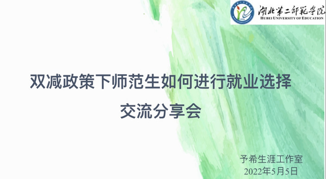 (通讯员 李冰倩)5月5日19时,湖北第二师范学院予希生涯工作室主办的成长故事汇榜样力量“双减政策下师范生如何进行就业选择”主题交流分享会顺利在线上进行。会议邀请教科院2014届毕业生张扬参加交流。教育科学学院学工办主任代黎明、就业服务中心部分学生干部、全校18.19级部分同学参加会议。20级小学教育1班杨缘缘主持会议。