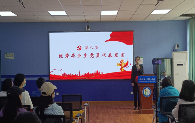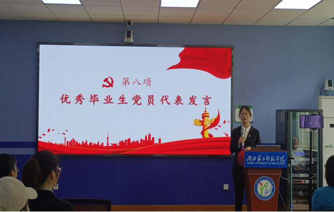 优秀毕业生党员代表2018级小学教育2班席夏翠、2018级应用心理学1班张万双依次发言。两位毕业生党员分别从学习、工作、实践、奉献等方面分享自己一路走来的成长经历,勉励非毕业生党员珍惜美好的大学时光,多读书、多锻炼自己。