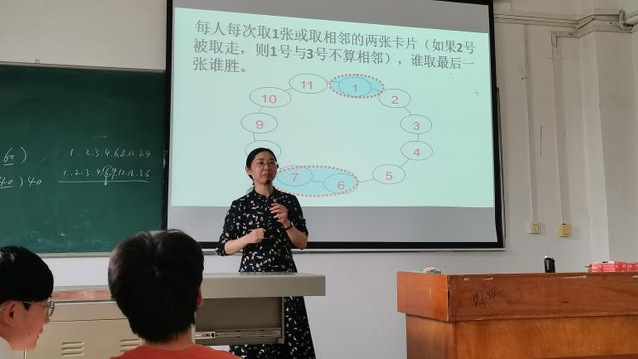 高中咏校长以“游戏与数学—思想方法”为主题,结合“植树问题”、“找次品”和“简单排列”的鲜活案例,讲解一一对应、优化和有序思考的数学思想方法,生动而富有启迪性,让大学生深深懂得了“做真数学,学真思考”原汁数学的教学魅力。