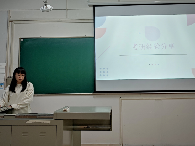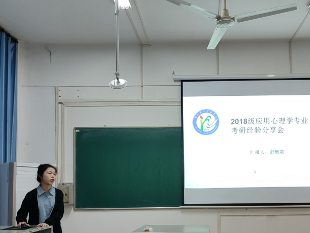 (图为2018级应用心理学1班学生舒樊奕分享考研成功经验)