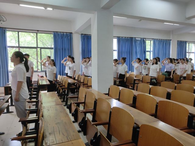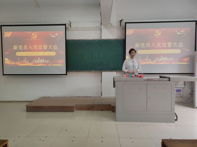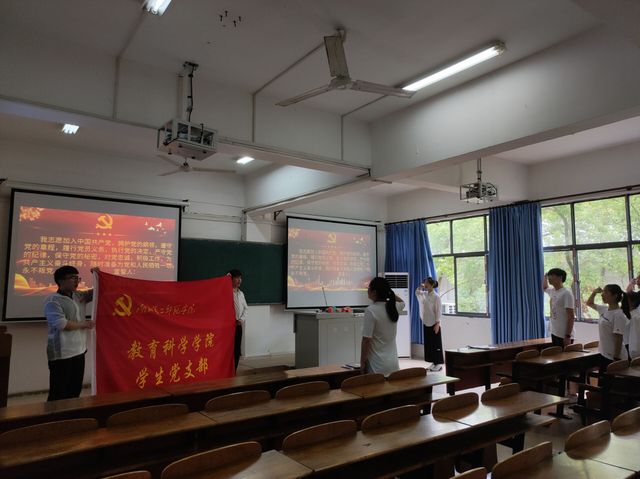 (通讯员 魏雅兰)6月3日中午12:05,教育科学学院(以下简称“教科院”)学生第一、第二党支部于五号教学楼5308教室开展新党员宣誓大会。教科院学生第二党支部书记杨霞出席此次会议。教科院新党员参加,20级学前教育1班黄晨卓担任主持人。