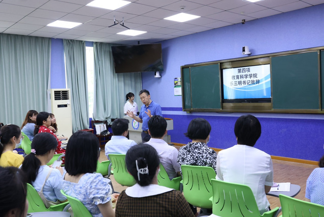 最后乐三明书记发表讲话。他分享了往届教育学专业的教研成果,借用习近平总书记的话强调教师要做好“四有”好老师,“四个引路人”,同时还建议同学们要时刻保持教育敏感性,积极关注教育热点。此次见面会在全体师生合影留念中圆满结束。