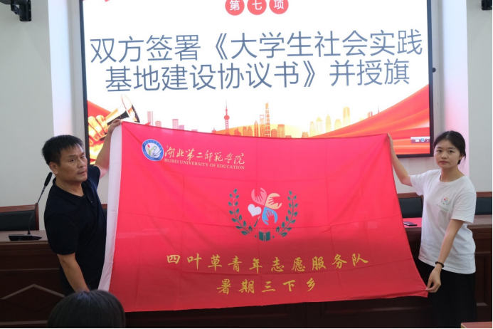 谈绍林从安全、纪律、品德以及学习这四个方面进行讲话,提醒志愿者和学生们要注意交通、溺水、食物中毒等安全问题。他教导学生们要服从管理、遵守纪律、团结友爱、爱护公物、讲究卫生,还要努力学习,能够有所收获。紧接着,谈绍林与唐志强签订《大学生社会实践建设协议书》并为四叶草青年志愿服务队授旗。