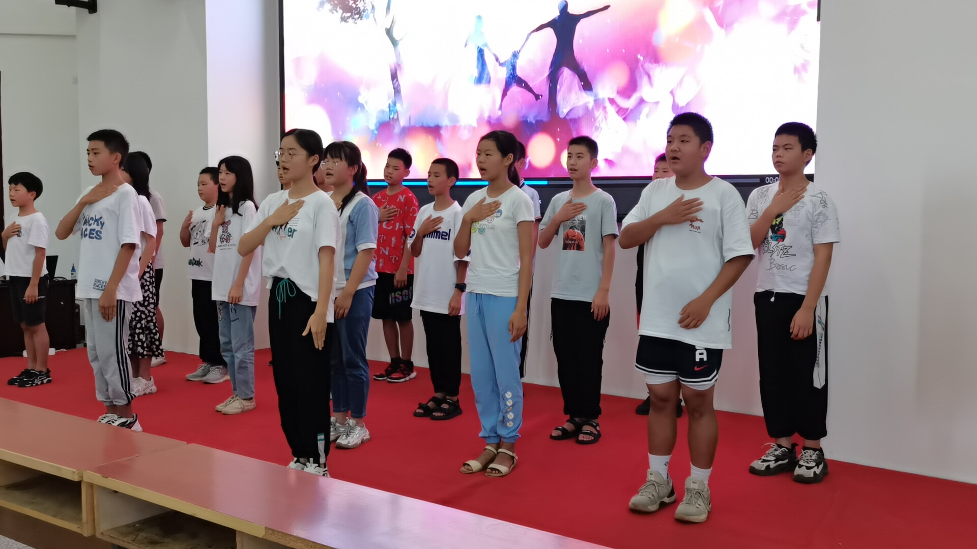 会议伊始,全体起立奏唱国歌。随后,全体参会人员共同观看结业视频,该视频展现了志愿者们多样的教学内容和方式、学生的学习成果以及多姿多彩的暑期生活风貌。