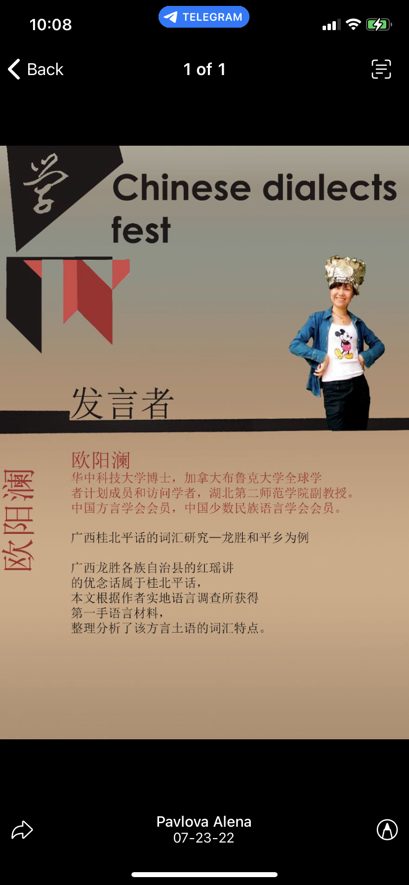 (通讯员 乐乐)湖北第二师范学院教育科学学院欧阳澜副教授应邀于多伦多时间2022年8月8日上午9:30分在telegram平台上参加了由俄罗斯推广汉语协会主办,俄罗斯国际方言论坛承办的“2022国际中文方言论坛”,并以《广西桂北平话的词汇特点》为题进行了大会发言。该论文根据笔者深入田野获取的第一手语言材料为事实依据,较为系统的介绍了广西龙胜红瑶平话的词汇特点,主要是从音节方面的特点、语素组合方面的特点和词义范围方面的特点进行了分析和归纳,同时列举出了部分有少数民族语言成份的民汉合璧词、少数民族语言来源的词、汉语古语词,对未知来源的词也进行了一些举例和探讨。欧阳澜在发言后回答了与会者的提问,在与来自香港中文大学的博士生陈希同学就桂南平话、桂北平话、粤语、闽语进行了较为深入的交流之后,一致认为应该尝试着打破西方方言分区的模式,从一个新的视角对汉语方言的分区问题进行思考。整个发言及答疑时间为90分钟,反响良好,与会者纷纷点赞。