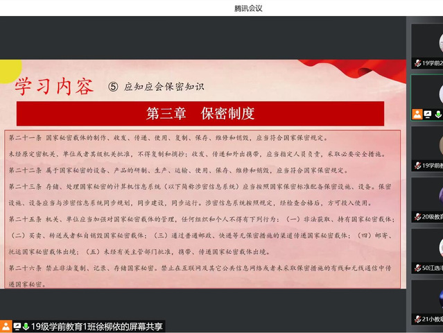 (通讯员 胡馨瑜)为了深入学习贯彻习近平总书记系列讲话以及第十二次党代会精神,进一步开展保密知识学习,8月15日晚7点,教育科学学院(以下简称“教科院”)学生第一、第二党支部联合开展7-8月主题党日学习活动。本次学习以在线会议方式开展。教科院学生第一党支部书记代黎明、学生第二党支部书记杨霞以及全体学生党员参加活动。2019级学前1班徐柳依主持。