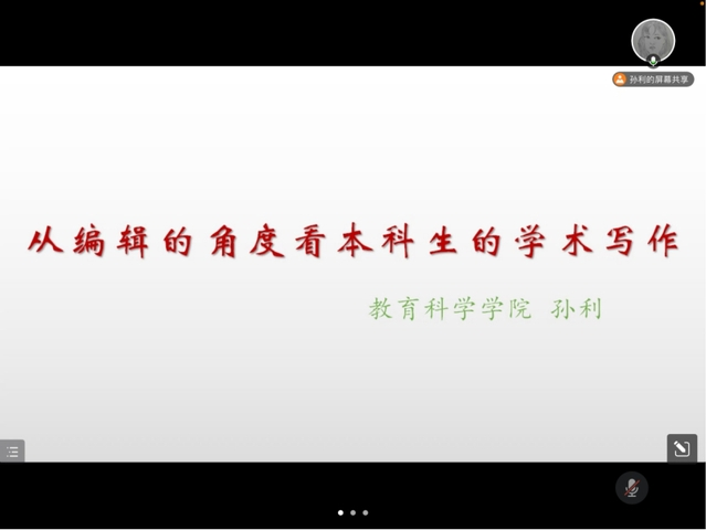 (通讯员 魏子怡)为提升科研训练营成员写作组织语言能力,提高学术写作表述水平,教育科学学院学生科研训练营于2022年6月23日星期四下午14:00ZAI1腾讯会议里召开了主题为《从编辑的角度看写作》学术讲座。教育科学学院心理学孙利教授主讲,部分教师参与,科研训练营成员参与,学生助理魏子怡主持。