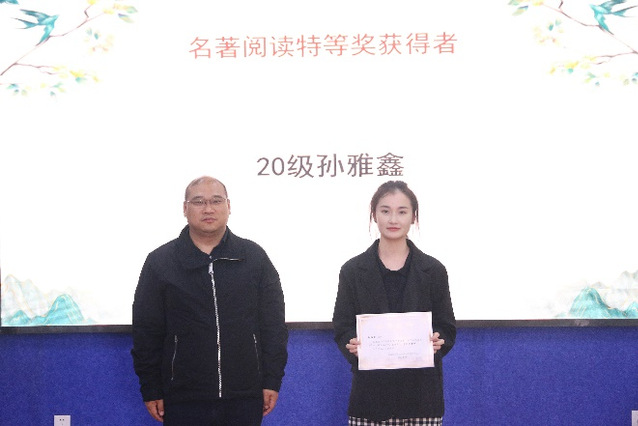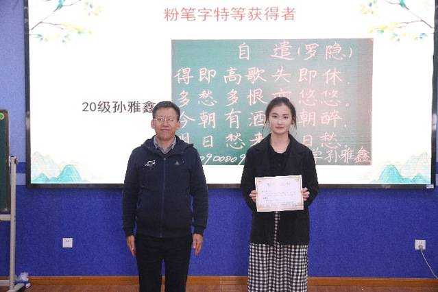 随后,乐三明书记宣读教育学专业第二届读书会、写字荟获奖学生名单。领导老师们就名著阅读、粉笔字、钢笔字、毛笔字四项内容为获奖学生颁发荣誉证书并与学生合影留念。并由粉笔字特等奖、名著阅读特等奖的学生代表——20级教育学专业孙雅鑫同学发言。她结合当今时代发展,阐明了师范生提升自身素质与基本职业技能的重要性,并向大家分享自身经验:“关于‘三笔字’,首先要学会观察,其次是勤加练习,同时向大家介绍了字帖的选择方法;关于‘名著阅读’,首先要提升阅读动机,其次是找准阅读方向及方法,其中采取滚雪球式的阅读方式往往会得到事半功倍的效果。”
