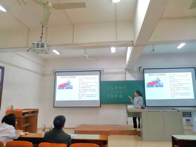 活动伊始,第一位试讲员江灿结合校内具体事例进行了对交通安全、电信诈骗这类问题的讲解。讲解结束后,魏豪指出试讲员在讲授时应注意两点:“第一,应准确了解校内的基本情况,列举恰当的事例;第二,要规范语言表述和讲述的措辞。”