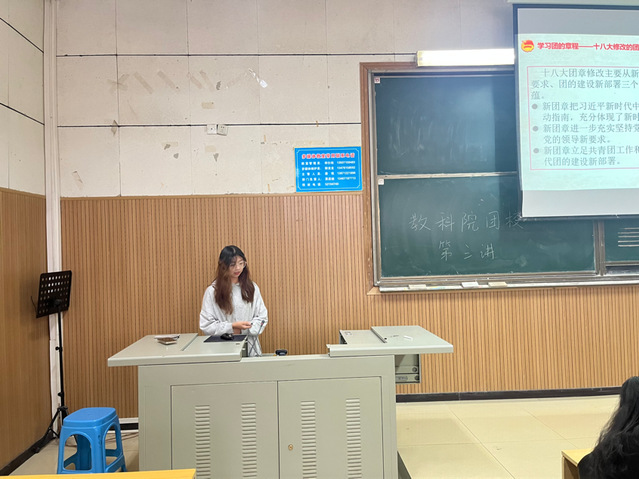 (通讯员 张丽雯)为进一步加强青年团员对团组织的认识,提高青年团员的思想理论水平和政治素养,增强作为团员的光荣感和责任感,10月24日中午12点20分,教育科学学院(以下简称“教科院”)第六期团校第三次团课于阶梯教室4顺利开展,20级教育学1班江婷以《追根溯源话团章》为主题,给团员们带来一堂精妙绝伦的团章学习课。
