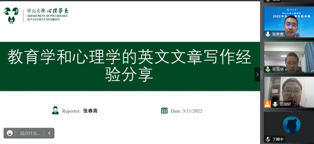 本网讯(通讯员 吴贤华)11月3日,由教育科学学院主办、学生发展协同研究中心和心理学系共同承办的英文论文写作与投稿专题学术讲座在晚上8点钟如期举行,讲座邀请了中山大学“百人计划”教授张春青以在线会议的方式进行,参与者包括学生发展协同研究中心成员、教育科学学院科研训练营学员等一百多人,讲座由学生发展协同研究副主任、应用心理学系主任吴贤华主持。