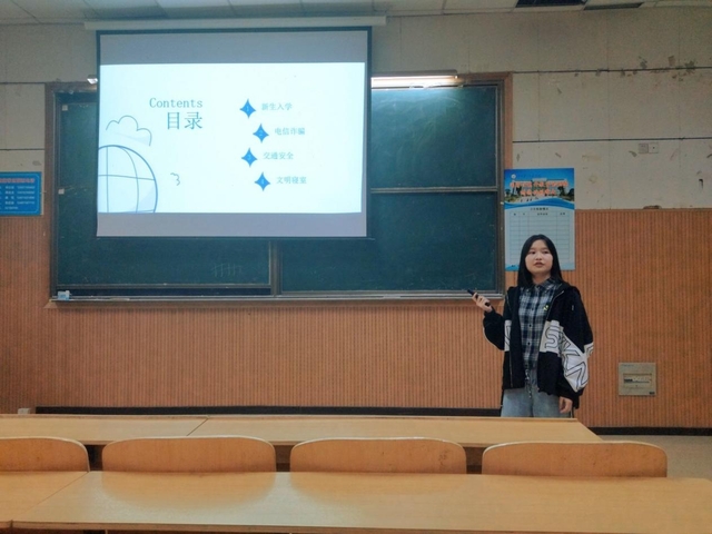 活动伊始,王梦洁从四个方面为新生带来了了较为全面的安全教育。首先她从新生入学入手,强调校纪校规的规范作用;随后她基于讲解电信诈骗的典型案例,提高学生对于电信诈骗的警惕性;接着她在校内交通安全方面对新生们的观念进行规范和纠正,最后她对新生进行宿舍关系指导,希望新生们能拥有良好的宿舍人际关系。这次活动旨在增强新生保护自身生命财产安全的意识,并对新生入学应有的学风建设进行指导。