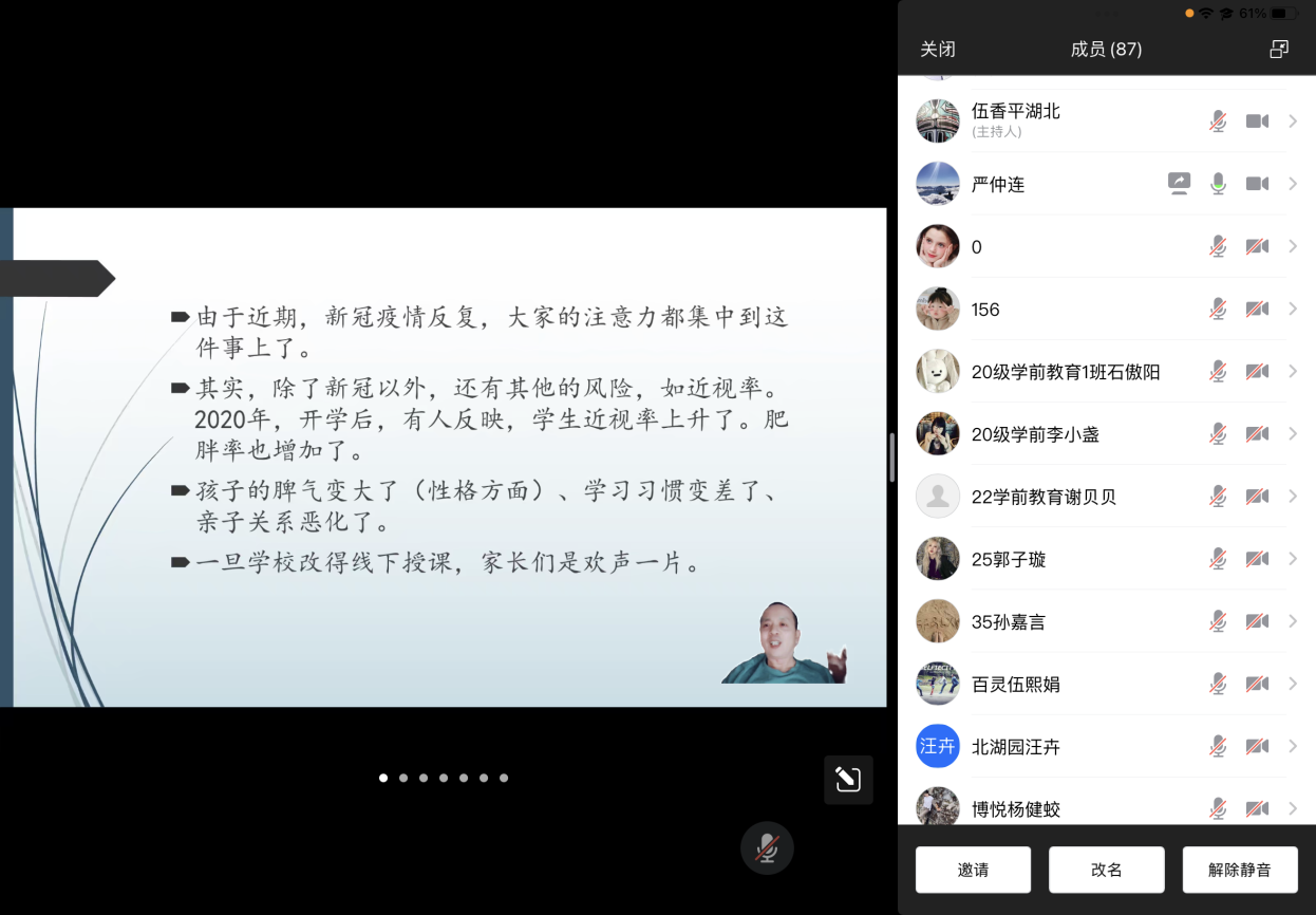 (本网讯 通讯员 王思婕)2022年11月10日14:30,湖北第二师范学院教育科学学院(下简称“教科院”)、湖北学前教育研究中心联合举办学前教育专业成立10周年系列活动之学术论坛。本次论坛特邀中国教育学会学前教育专业委员会副理事长、东北师范大学博士生导师严仲连教授做题为《学前教育发展中的风险及防范》的线上专题讲座。讲座由教科院学前教育专业负责人、湖北学前教育研究中心主任伍香平教授主持,教科院院长张红梅、教科院学前教育专业师生以及湖北省一线幼儿园教师参加。