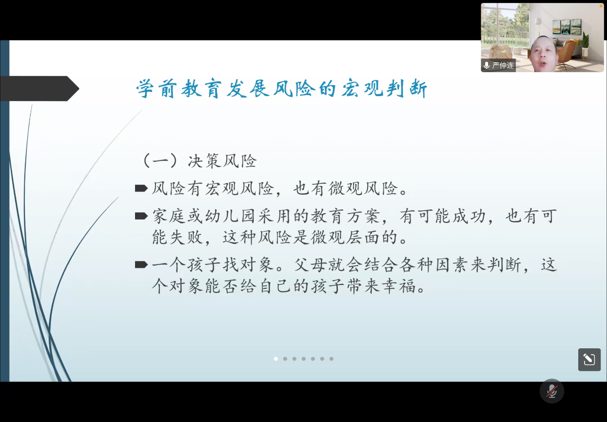 (本网讯 通讯员 王思婕)2022年11月10日14:30,湖北第二师范学院教育科学学院(下简称“教科院”)、湖北学前教育研究中心联合举办学前教育专业成立10周年系列活动之学术论坛。本次论坛特邀中国教育学会学前教育专业委员会副理事长、东北师范大学博士生导师严仲连教授做题为《学前教育发展中的风险及防范》的线上专题讲座。讲座由教科院学前教育专业负责人、湖北学前教育研究中心主任伍香平教授主持,教科院院长张红梅、教科院学前教育专业师生以及湖北省一线幼儿园教师参加。