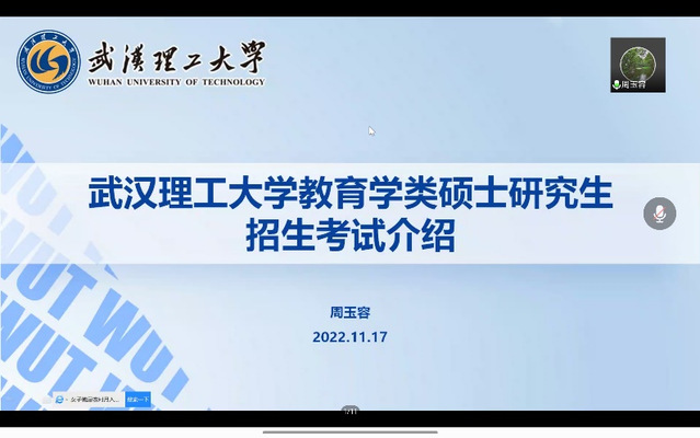(通讯员 孙雅鑫)11月17日下午2点,“四有好老师”之“师陶学陶”系列活动——“武汉理工大学教育学类硕士研究生招生考试介绍”专题讲座以线上会议形式顺利开展。武汉理工大学法学与人文社会学院副教授周玉容为湖北第二师范学院教育科学学院教育学专业师生带来了一场细致深入的讲座。教育学专业2020级、2021级全体学生参加此次讲座,会议由2019级教育学1班班长江诚伟主持。