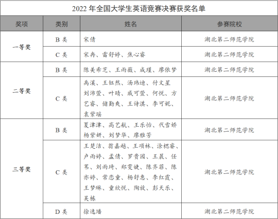 本网讯(通讯员 伍晓飞 蔡玛莉)近日,由教育部有关部门批准、国际英语外语教师协会中国英语外语教师协会(TEFL China)和高等学校大学外语教学研究会联合主办的2022年全国大学生英语竞赛全国决赛结果公布!我校学子荣获英语专业类一等奖1项、二等奖4项、三等奖7项;非英语专业类一等奖3项、二等奖13项、三等奖22项,成果丰硕。其中,我校外国语学院宋倩、物理与机电工程学院宋冉、新闻与传播学院雷舒婷、焦心睿4名同学分别荣获专业组、非专业组一等奖。