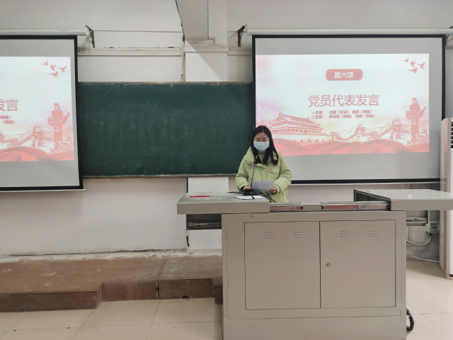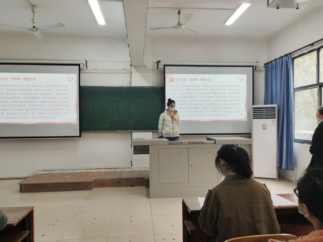 紧接着,樊奕带领大家学习党章第十章第五十一、五十二条内容,并领学党的二十大报告相关内容,全体人员共同观看党员实践活动视频。随后,党员代表踊跃发言,交流学习心得体会。学生第一党支部党员沈倩、肖妍,学生第二党支部党员李诗琪、刘妍四位同学,根据本次主题党日活动学习的内容,分别进行了交流讨论。最后进行学习党的二十大精神的微课展播。