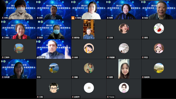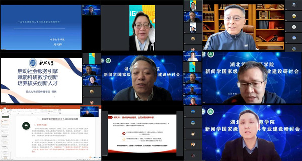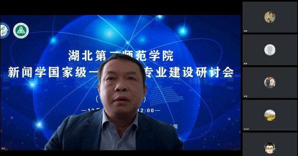 本网讯(通讯员 杨雯)12月15日上午,我校新闻与传播学院举行新闻学国家级一流本科专业建设研讨会(线上线下),武汉大学新闻与传播学院院长强月新、华中科技大学新闻与信息传播学院院长张明新、华中师范大学副校长彭南生等12位来自全国高校的教授齐聚新闻与传播学院,聆听新闻学国家级一流本科专业建设情况汇报,并依次做主题演讲。本次研讨会由中央民族大学新闻与传播学院特聘院长张昆主持,湖北第二师范学院副校长陈勇致辞,校长郑军致答谢词,新闻与传播学院全体教职工参会。