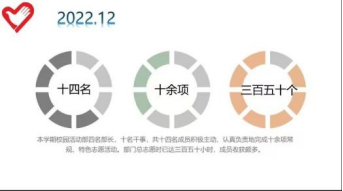 会议第三项,各部门干部进行部门工作汇报,校园活动部部长乐怡然进行部门工作成果展示,总结收获,对优秀干事提出表扬,指出存在的不足,提出未来展望。办公室副部长黄蓝汇报部门工作,展示2022年度认证的志愿时长和存档工作。宣传部部长周欣雨展示近半年的文稿数据汇总与优质推文和展板绘图,总结分析部门的优势与劣势,提出针对性培养和提供学习机会的未来计划。外联部部长王鑫棋汇报工作成果,展示具体活动安排,分享经验。
